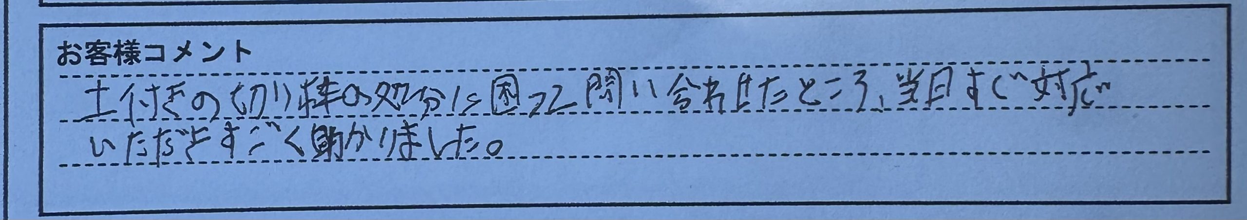 「土付きの切り株の処分に困って問い合わせたところ、当日すぐ対応いただきすごく助かりました。」