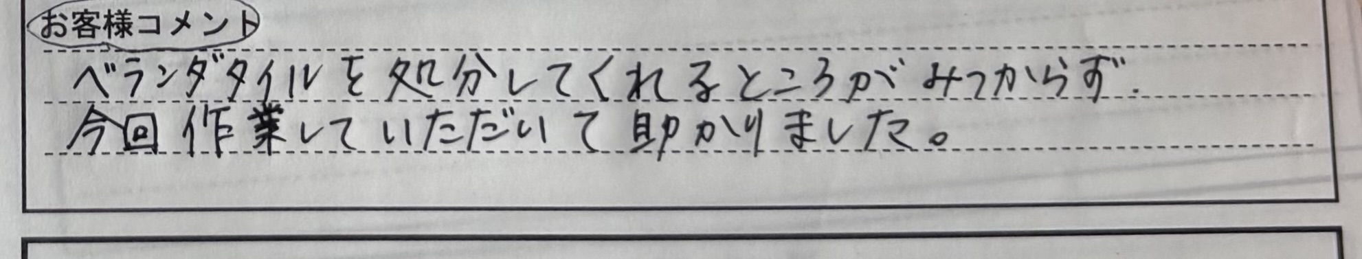 『ベランダタイルを処分してくれるところが見つからず今回、作業して頂いて助かりました。』
