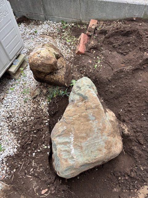 『戸建て裏庭に長年ある庭石をどかして、芝生を敷きたいと思い掘り起こしてみたのですがどうにも大きさも重さもあり個人の手には負えるレベルじゃないと思いコチラにお電話してみた次第です。出来ればお休みの今日のうちに片付けたいと考えてましてすぐに来てもらう事は可能ですか?』