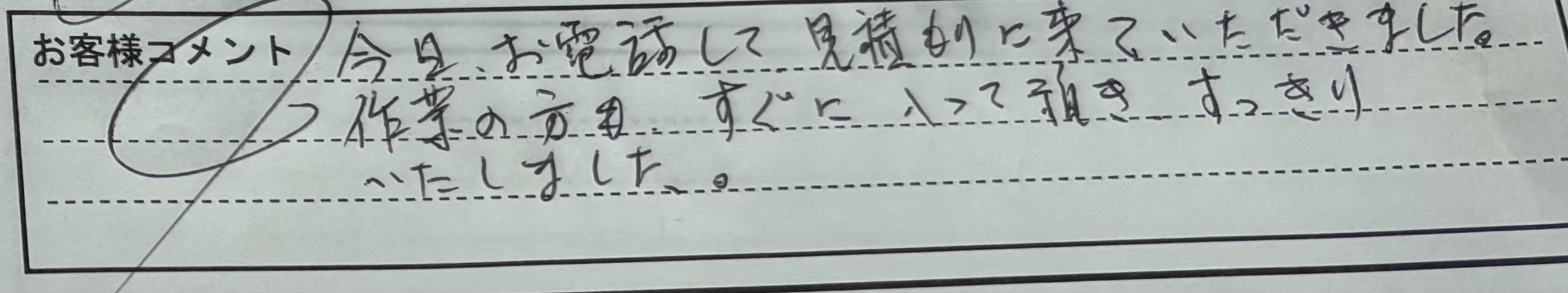 『今日、お電話をして見積もりに来て頂きました。作業の方もすぐに入って頂きすっきり致しました。』