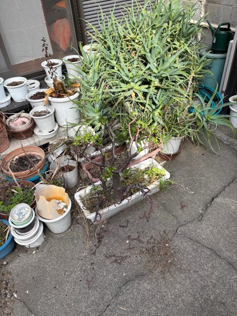 戸建て玄関前部分に長年、置いていたことにより大きくなった植木や植木鉢などを