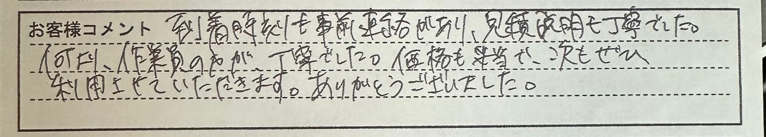 『到着時刻も事前連絡があり、見積説明も丁寧でした。何より作業員の方が丁寧でした。価格も妥当で、次もぜひ利用させていただきます。ありがとうございました。』