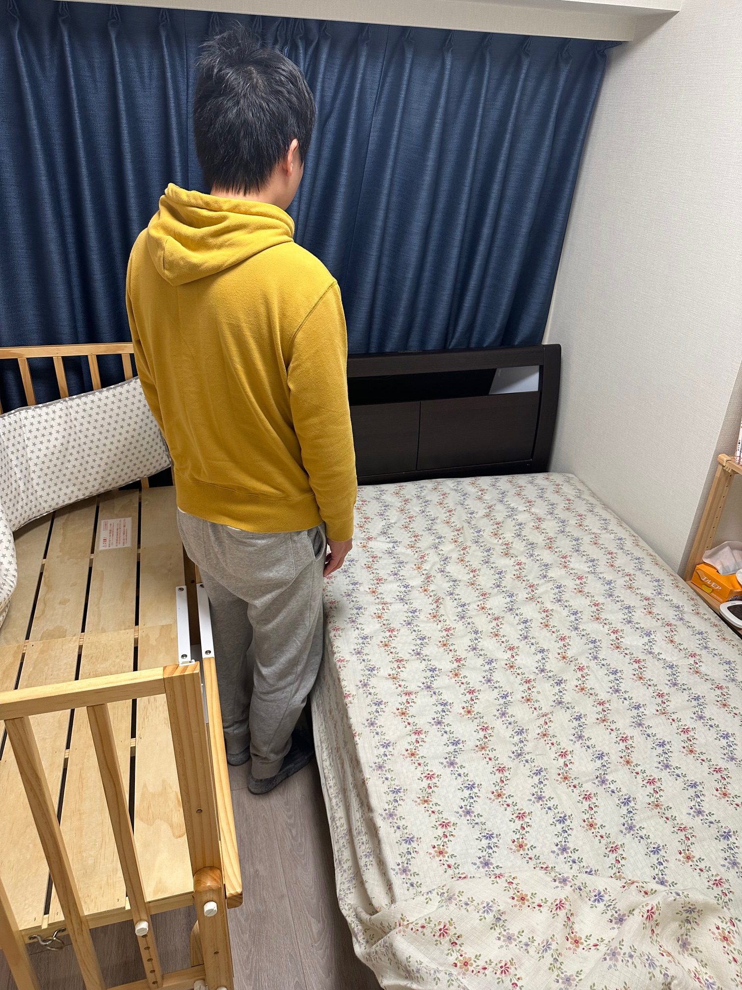 長年使用してきたシングルサイズの木製収納付きベッドは、サイズも重量もあり、模様替えの動線確保のためには早めの撤去が必要。しかし、