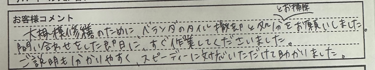 『大規模修繕のために、ベランダのタイル撤去と処分とお掃除をお願いしました。問い合わせをした即日に、すぐ作業してくださいました。ご説明も分かりやすく、スピーディーに対応いただけて助かりました。』